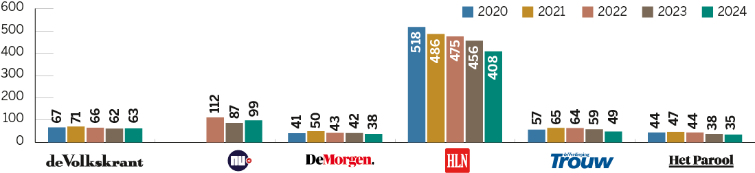 Dit geeft de omvang van de redactie weer, omgerekend in voltijds banen (fte). Het zijn zowel de verslaggevers als de chefs, eindredacteuren, vormgevers, beeldredacteuren, video- en podcastmakers en onlineredacteuren. Om het beeld zuiver te houden zijn de freelance journalisten niet opgenomen. Die leveren eveneens een belangrijke bijdrage in de vorm van artikelen, columns, beeld, audio en video. Het zijn er soms honderden per titel. Aantal en werkzaamheden fluctueren van jaar tot jaar.