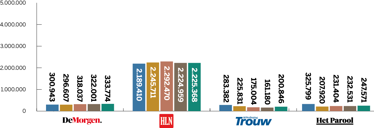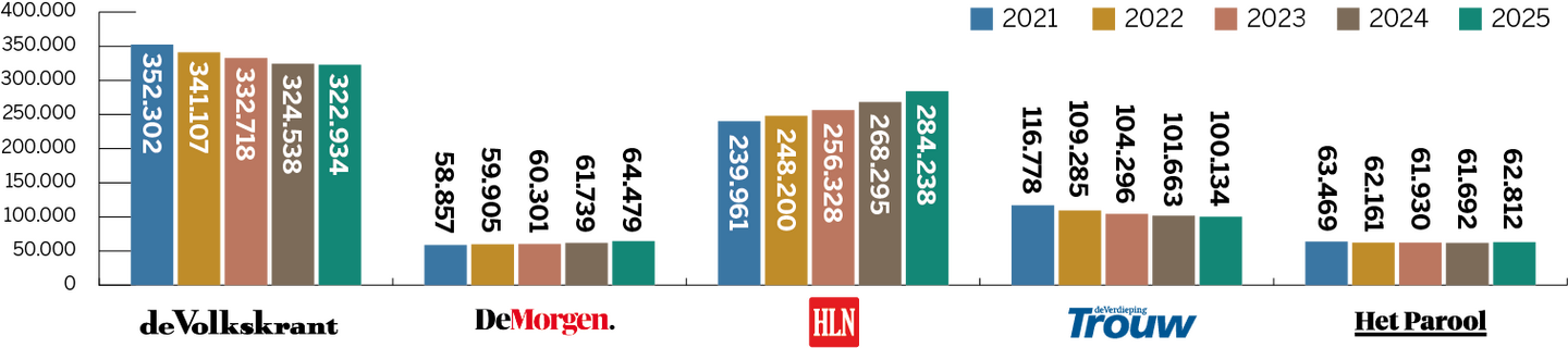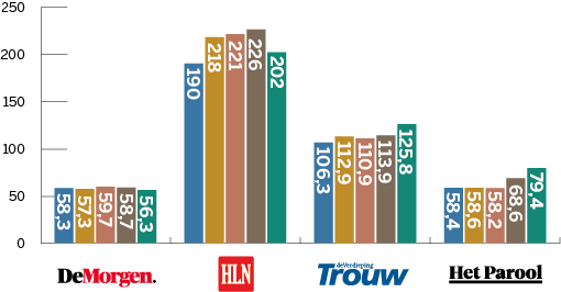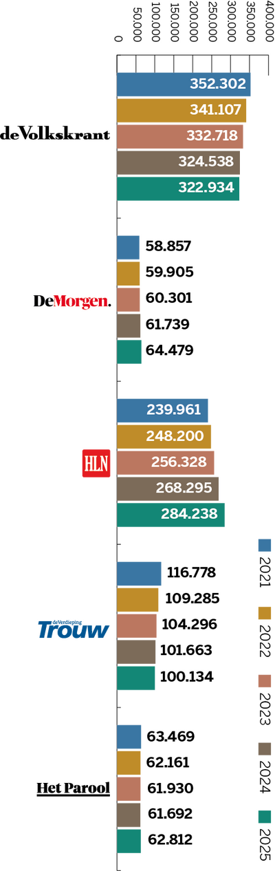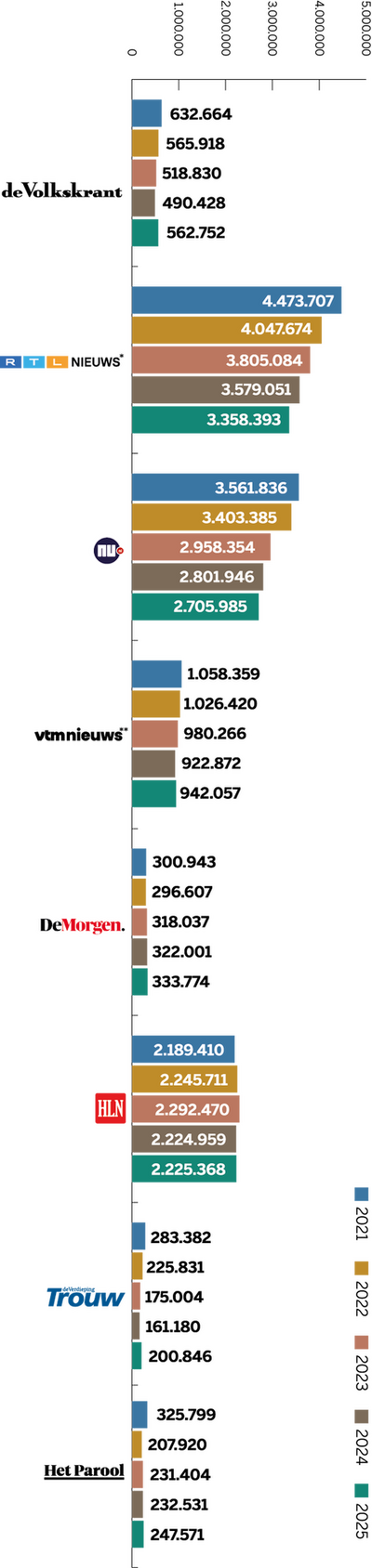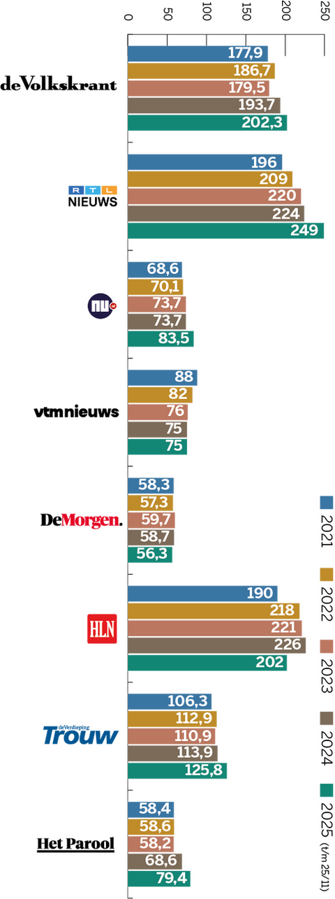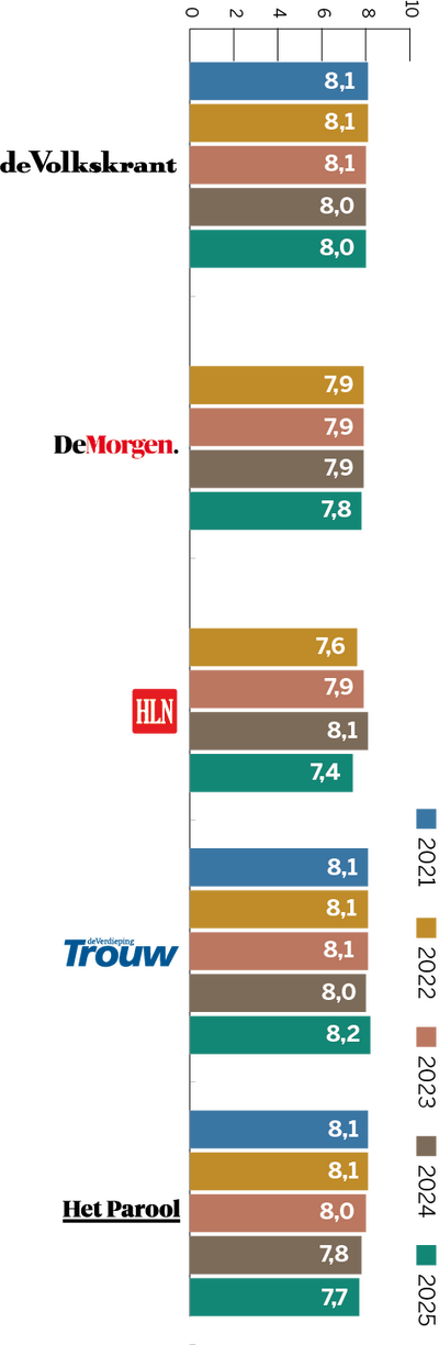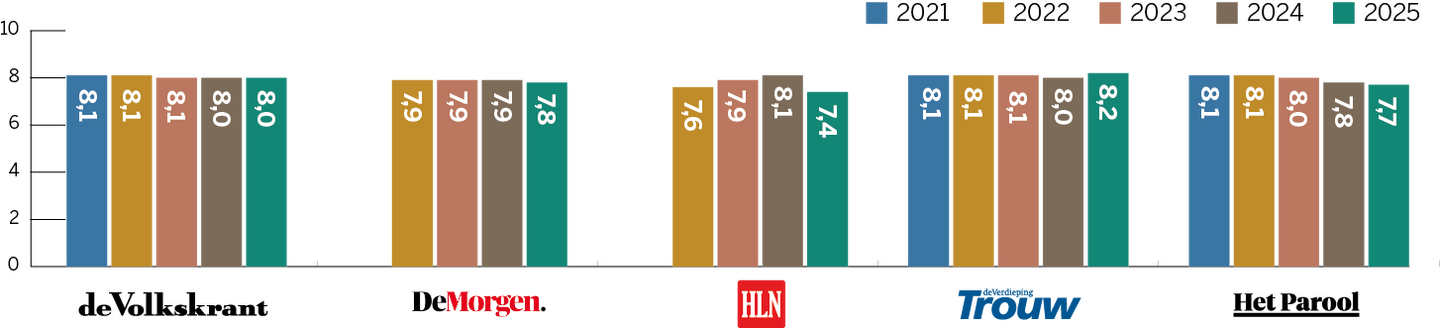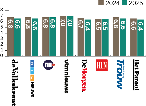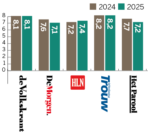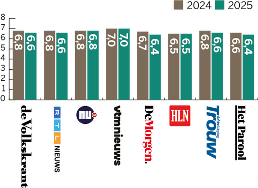 Dit cijfer is afkomstig uit recent onderzoek naar merkvertrouwen in opdracht van DPG Media. Daarbij geeft een algemeen publiek, dus niet alleen abonnees of bezoekers, vertrouwen in verschillende nieuwsmedia aan op een schaal van 0 (helemaal niet betrouwbaar) tot 10 (uiterst betrouwbaar). Daarnaast worden abonnees uitgesplitst, die hun titel doorgaans meer dan gemiddeld vertrouwen. Deze onderzoeksmethode en de uitkomsten komen overeen met die van het jaarlijkse Digital News Report van hetReuters Institute in Oxford. De Nederlandse en Vlaamse gemiddelde vertrouwenscijfers liggen in die monitor hoger dan die van nieuwsmedia in de omringende Europese landen.